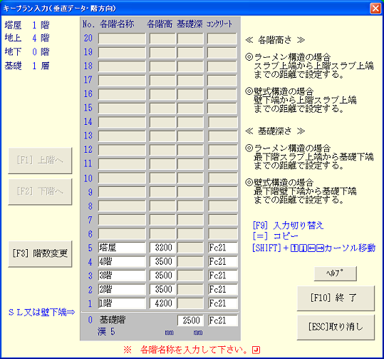 各階の名称と寸法を入力します。 最大50Fまで入力可能。 |
