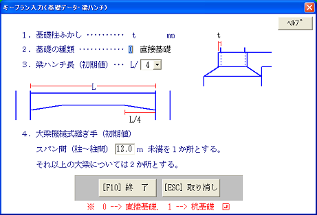 1.基礎柱ふかしは伏図入力時設定できます。 2.基礎の種類を選択できます。 3.梁ハンチ長の初期値【L/3〜L/10】から 選択、設定できます。 4.大梁機械式継ぎ手(初期値)を 設定できます。 |