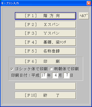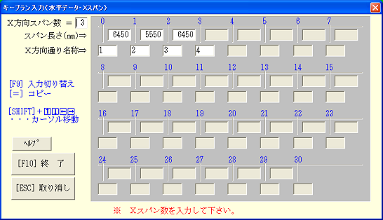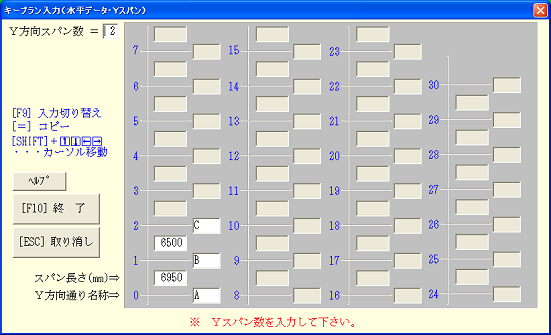 通り芯名称、寸法を入力。 最大30スパンまで入力可能。 ※伏図入力の時、 補助線の追加可能 線は最大150本まで。 |