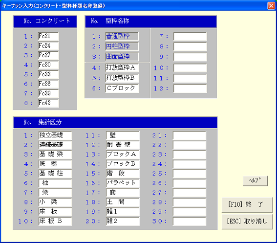 コンクリート、型枠、集計区分 の名称を変更できます。 |